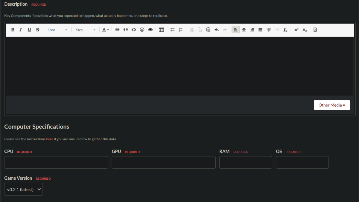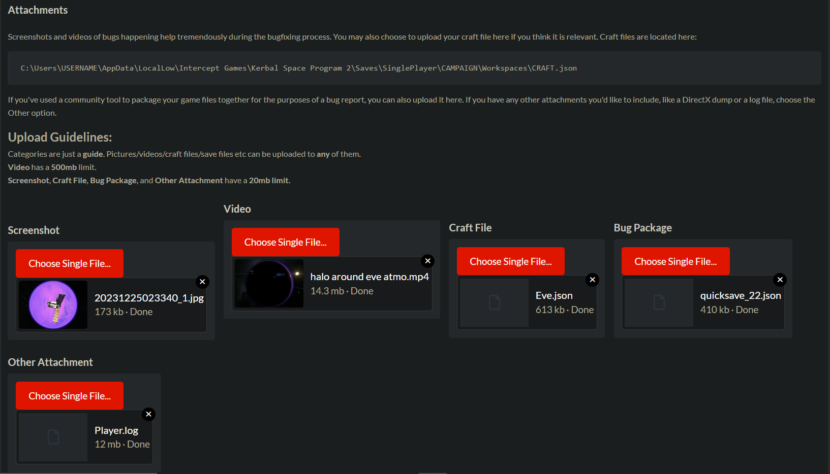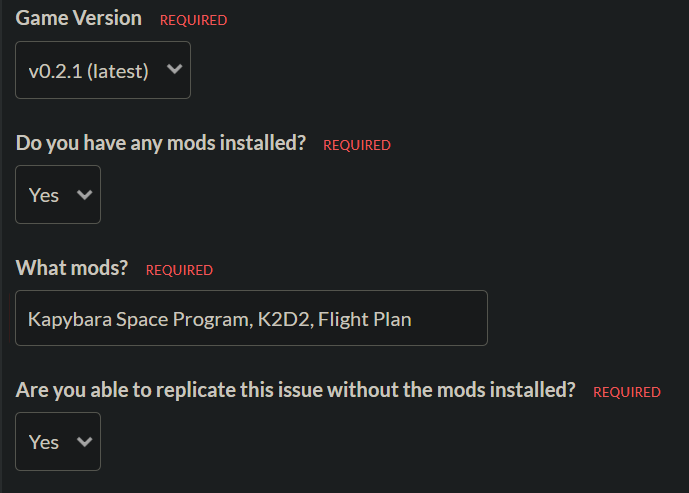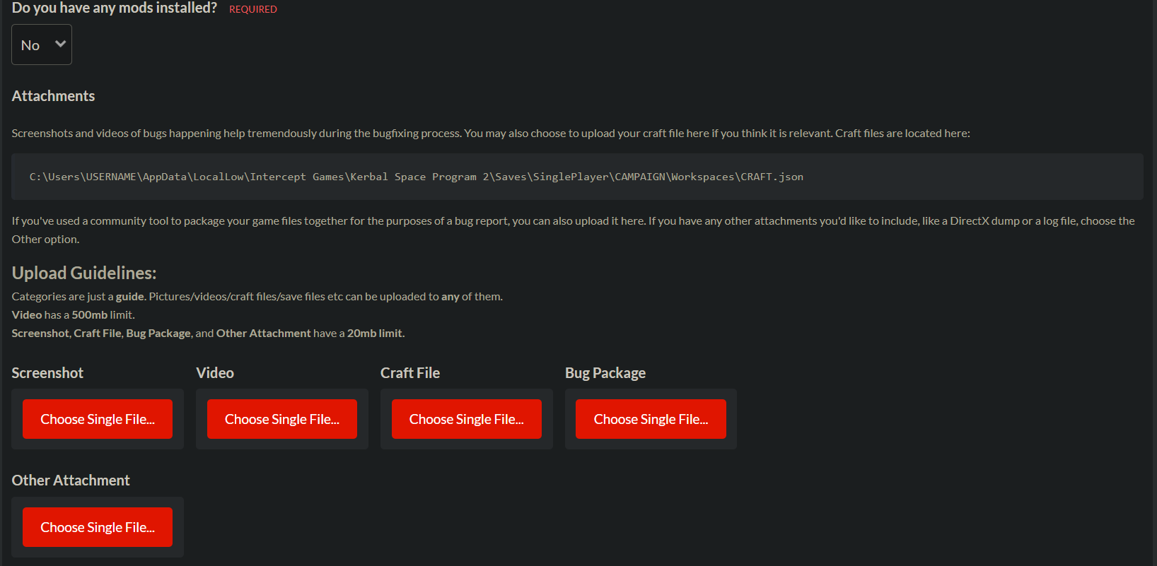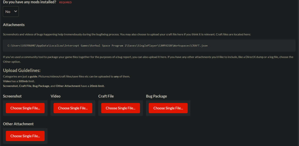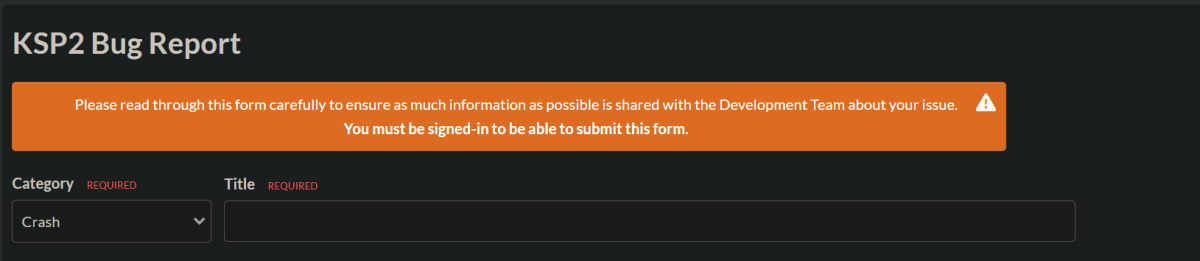 How To Report Bugs This is a detailed guide on how you should report bugs on this subforum. Please make sure to go over every step before submitting a report. you can find a blank bug report template at the bottom of this page. The basic rules: One bug per bug report Avoid Duplicates (bugs that have already been reported) Include ALL necessary files (save/craft files, logs, images/videos...) Do not report feedback or suggestions Step 1. Is This A Bug? A bug is any form of unexpected behavior that occurs while playing the game. This can range from small typos in mission descriptions to mission-ending problems with say, docking ports. Bugs come in all shapes and sizes, but they all have one thing in common; The game is not doing what it's intended to do, and it's (usually) negatively affecting gameplay. If your issue does not meet this criterium, please ask yourself if it might be better suited as feedback instead. Bug reports that are really feedback usually don't make it through our quality check. Feedback and Suggestions can be posted in the appropriate channel here. Some examples: "I want to be able to see upcoming transfer windows!" => This is a Suggestion "The VAB should let in more ambient light, it feels too moody in there" => This is Feedback "My vessel falls through the surface on Vall..." => This is a Bug! "My DeltaV readout in the VAB is completely wrong!" => This is a Bug! Step 2. Has This Been Reported Before? To keep the bug reports subforum clear of clutter and avoid spreading upvotes over multiple reports, we urge you to please make sure the bug you are reporting hasn't been previously reported. Don't forget to check the KSP2 Bug Reports Archive too; all bugs below a certain upvote treshold and/or age are moved into the Archives each time the game receives an update, and we rely on you to identify what bugs are still in the game. You can quickly let us a know a bug is still happening by submitting a new bug report that links to the one in the archive, or by tagging us under it in a comment (@Bug Hunter). Thanks! Additional information on a bug can still be helpful, so if you run into a previously reported bug and would like to report it anyway; make sure to include a link to the existing report in your new report. This makes it easier for the Bug Hunter team to merge your report into that one, ensuring reports about a given bug stay centralized in one thread. For this reason, we also ask you to Please limit yourself to ONE bug per report. How to search the forum for existing bug reports: (important!) Step 3. Gathering Information Before submitting a bug report, try to collect as much information about the bug as possible. Try to describe the issue as well as you can. Be concise, but also include details: If you ran into an issue with a rocket, how did you build that rocket? If your trajectory looks weird around a certain planet, how did you get there? what launch vehicle did you use? Ask yourself these questions: What is happening? [REQUIRED] What did you expect to happen? Can this be reproduced? If yes, how? How severe is this bug? Other information for your report: Your Systems Specifications: CPU, GPU, RAM and OS [REQUIRED] Images and Videos Craft and Save files [in .json format] Game logs Player logs [For Localization bugs only] Localization string Not every bug report needs to have all this info. Sometimes a single line describing the issue is enough ("Hey, there's a typo in this part description..."), but in general try to include as many of these items as possible. The more complex the bug, the more info should be in the report. Save files, Craft files, Videos/Images, Reproduction Steps and Game Logs help the Bug Hunter team and QA to understand, reproduce and test your bug. Your efforts to collect these are greatly appreciated! How to Find Save/Craft Files, Game Logs and System Specs: A Note On System Specs: If you are below the minimum required specs for the game, you can still report bugs. Please mention this in your report however, and be aware that depending on the nature of your report your issue may not be a priority for the QA team. Step 4. Formatting And Submitting Your Report Once you have all the information you think you'll need, it's time to make a report. This paragraph will deal with what needs to be in that report, and how to format it properly. You'll also find an empty report template at the bottom of this paragraph. You do not have to be logged in to submit a bug report, but please note that submitting a report anonymously makes it impossible for the Bug Hunter team to contact you if they need more information about your report! Also keep in mind that Bug Hunters may change certain aspects of your report (such as title or category) or add context if deemed necessary. To begin writing your report, go to https://forum.kerbalspaceprogram.com/forms/2-ksp2br/ This will take you to the Bug Reports Form. It should look like this: Category First, you will need to choose a fitting category for your bug. If you are unsure what category best describes your bug, take a look in the spoiler below to see the various categories and which bugs generally fall under them. Don't worry about getting it wrong: the Bug Hunter team will change the category to whichever one fits best during the review process (if needed). Title Next, choose a title for your report. This should be a short sentence that accurately describes the bug. Ideally, your title should follow the Problem-Action-Location Format: - Problem: The bug itself, e.g. "Vessel Explodes" - Action: The action you were doing when the bug occurred (if applicable), e.g. "After Loading Quicksave" - Location: The situation the bug occurs in, e.g. "In Low Orbit Around Kerbin" Example of a Good Title: "Vessel Control Is Not Transferred When Clicking 'Control' In The Tracking Station" => Perfect! Examples of a Bad Title: "Tracking Station Bug" => Not descriptive enough "This stupid bug wont let me control my rocket afte